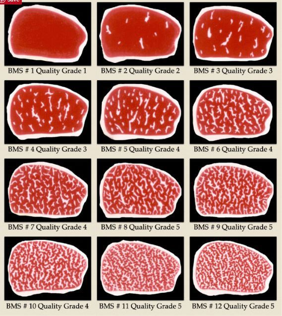 Dies ist das Beispiel für den Marbling Score, wie er in Japan gemessen wird. Die nachfolgende Tabelle verdeutlicht die Unterschiede zwischen den verschiedenen Methoden: