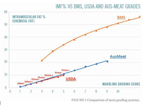 Diese Tabelle ist von der Homepage der Australian Wagyu Association. Sie verdeutlicht, dass zum Beispiel eine Marmorierung von 9 bei den Australiern einen intramuskulären Fettgehalt von mindestens 21% hat, während ein BMS von 9 nach dem japanischen System einen intramuskulären Fettgehalt von annähernd 50% bezeichnet.